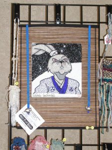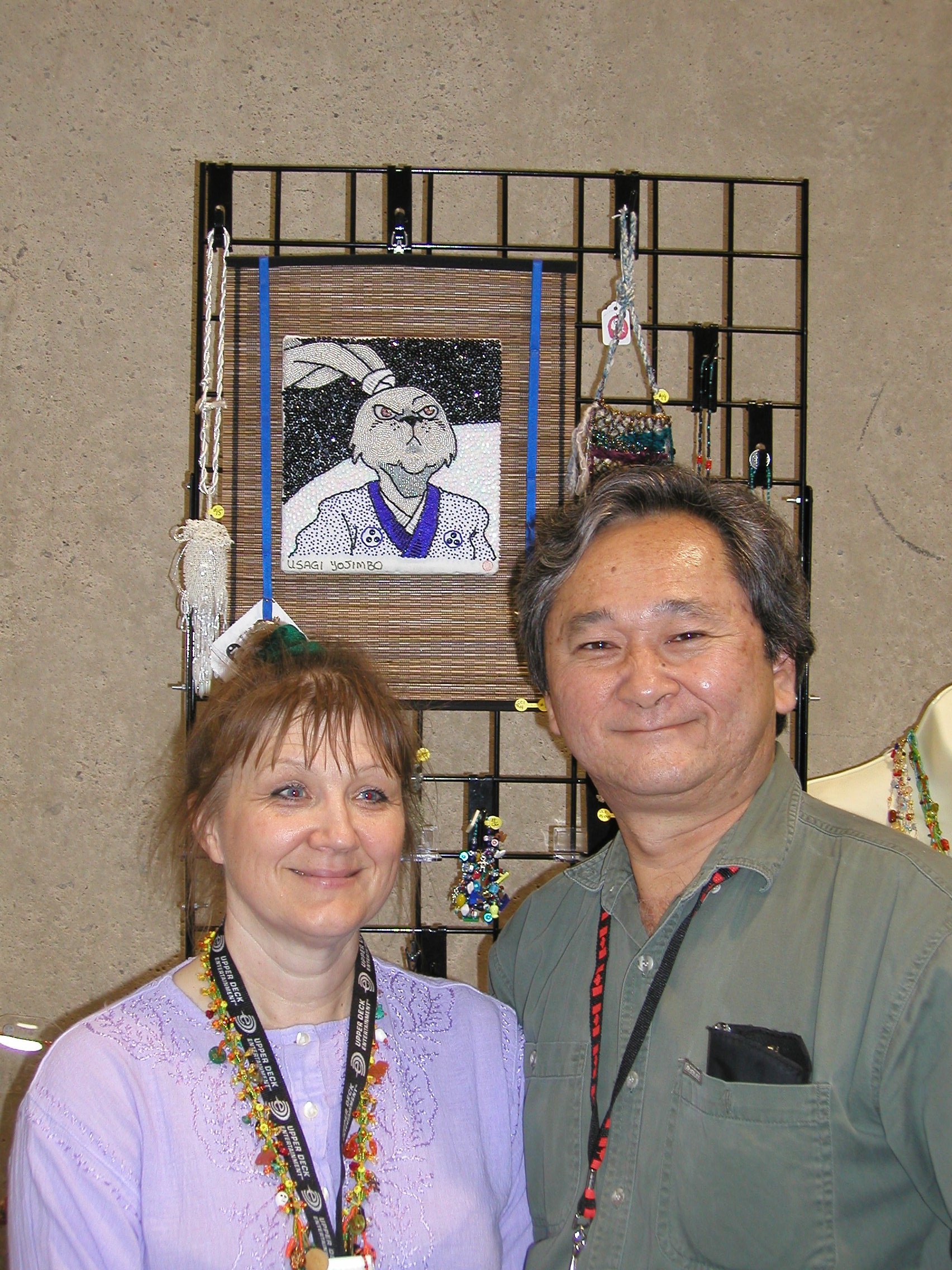 Stan and Kaytee Sumida standing under her embroidery (Usagi piece is not for sale) |
